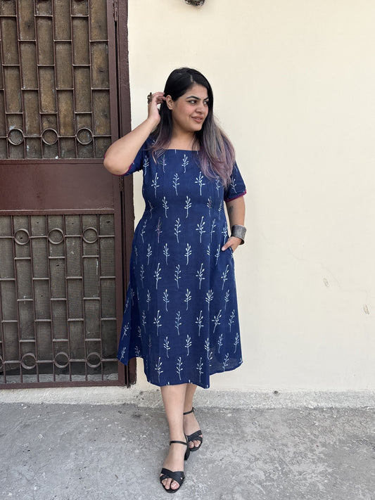 Indigo Patchwork Hand Block Printed Comfort Fit Knee Length Dress