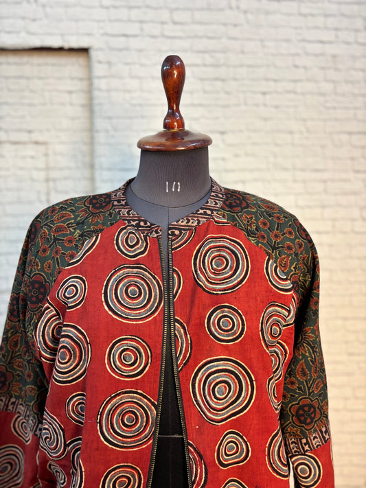 Red Green Ajrakh Hand Block Printed Unisex Bomber Jacket