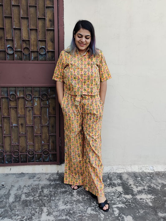 Yellow Red Floral Hand Block Printed Coordinated Set with Shirt and Flared Pants