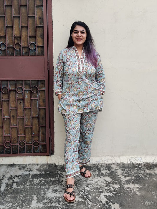 Green Blue Hand Block Printed Short Kurti Coordinated Set with Lace Detailing