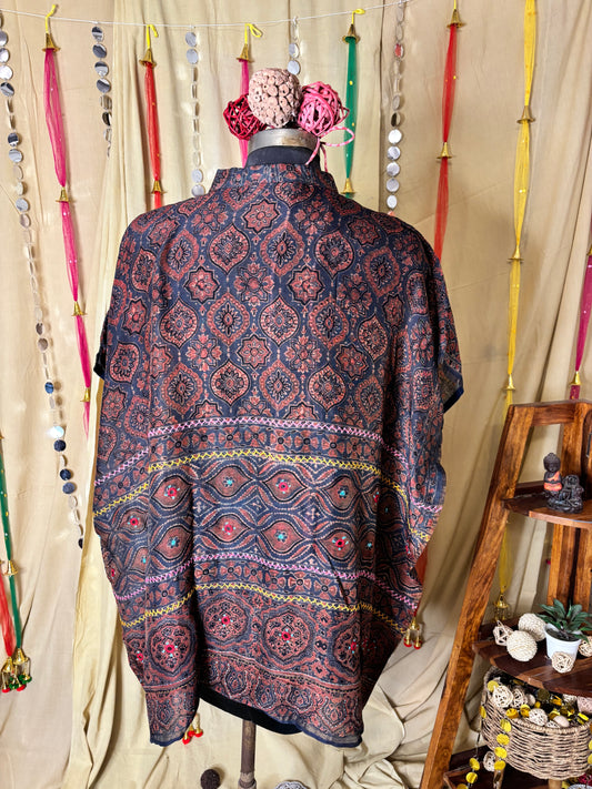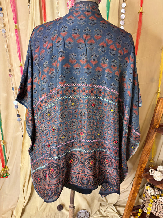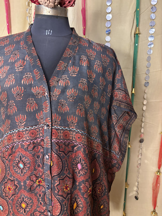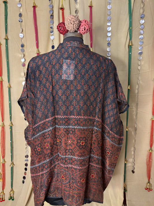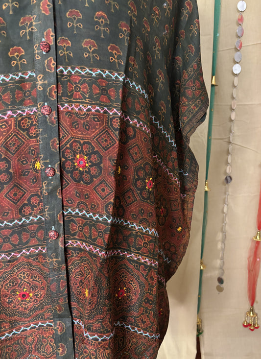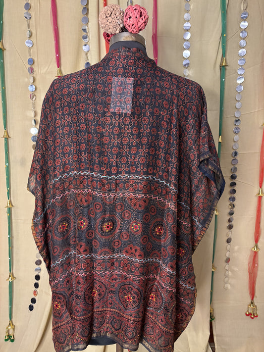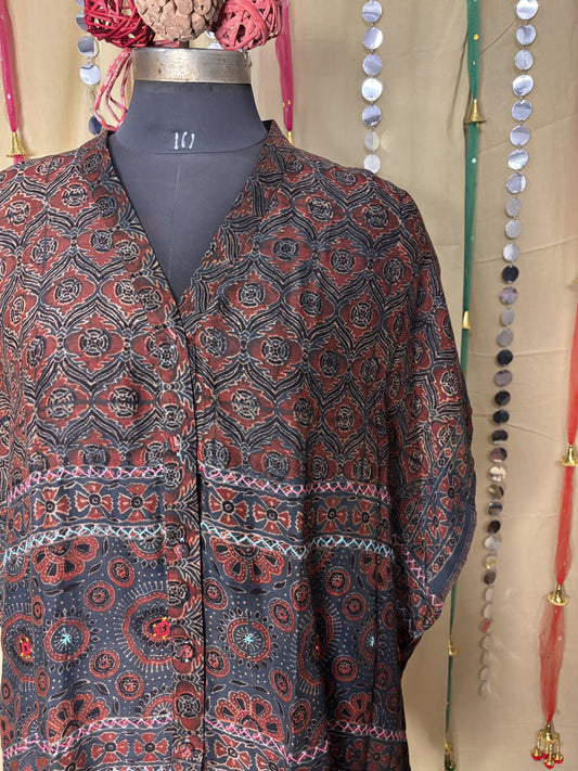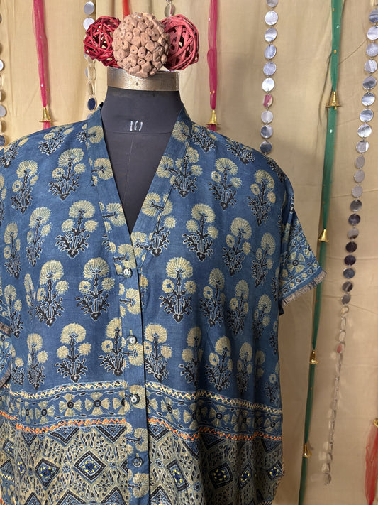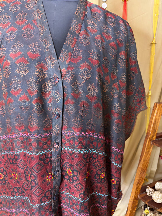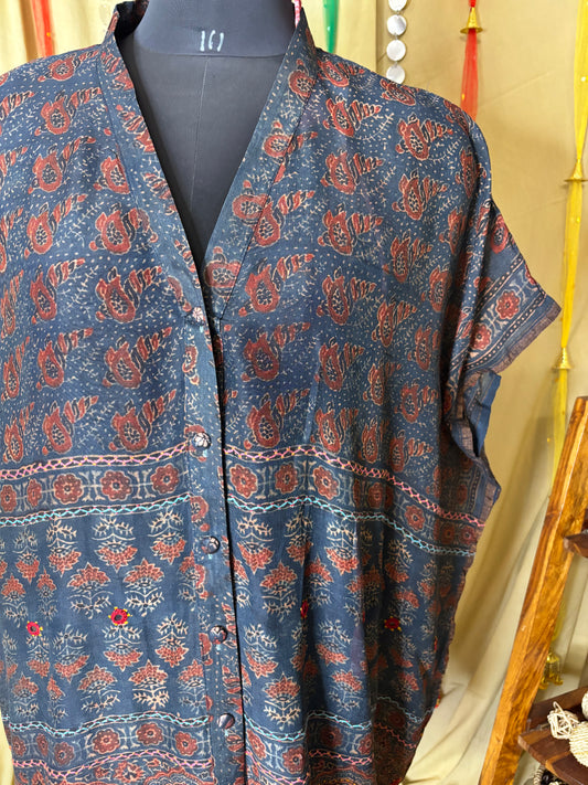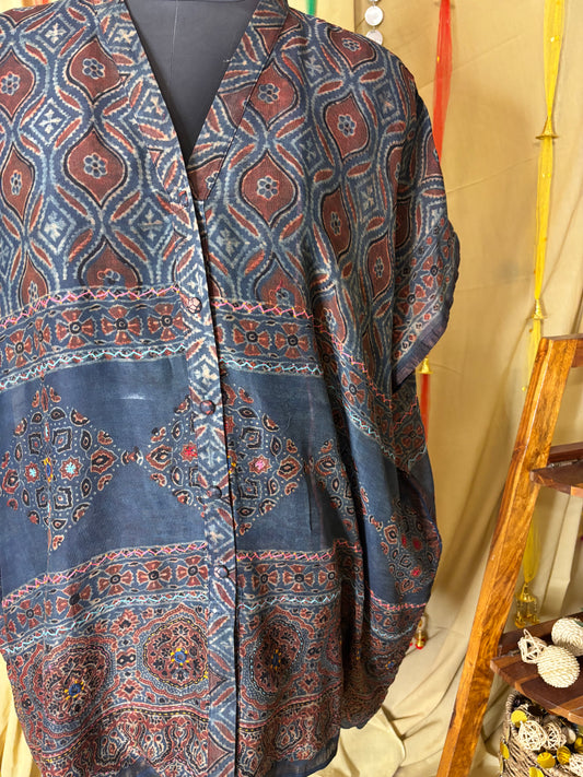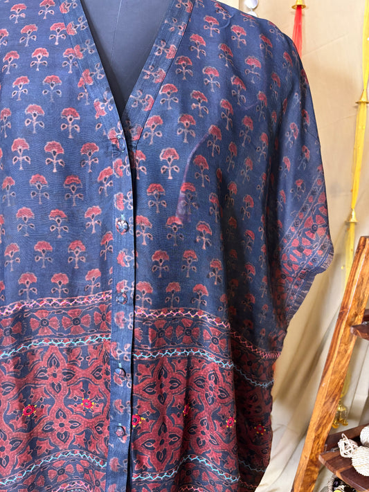 Indigo Red Ajrakh Chanderi Shirt Kaftan with Hand Embroidery