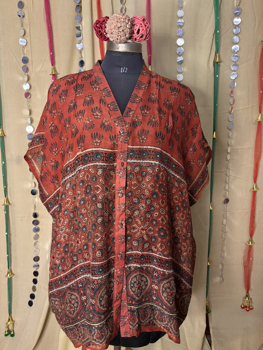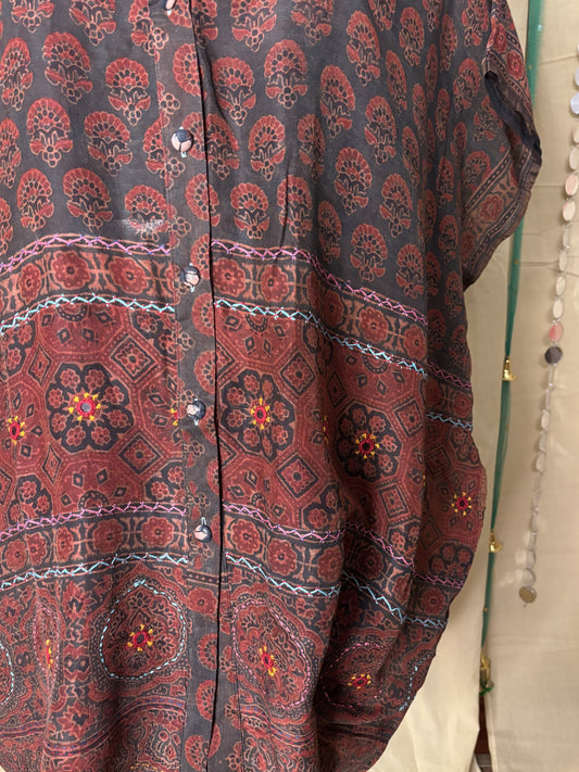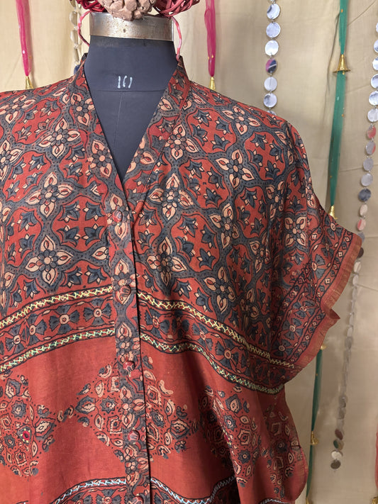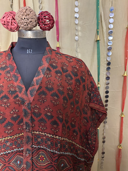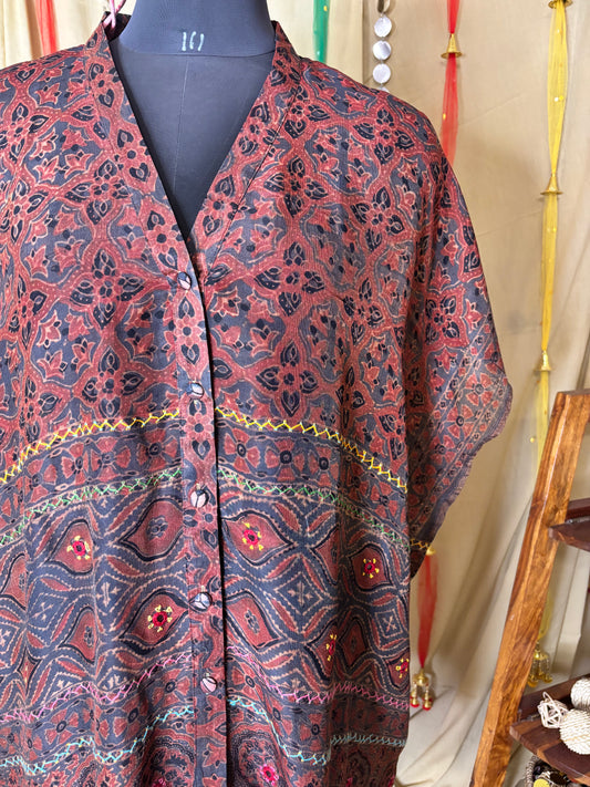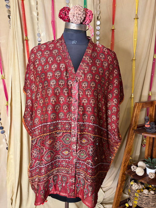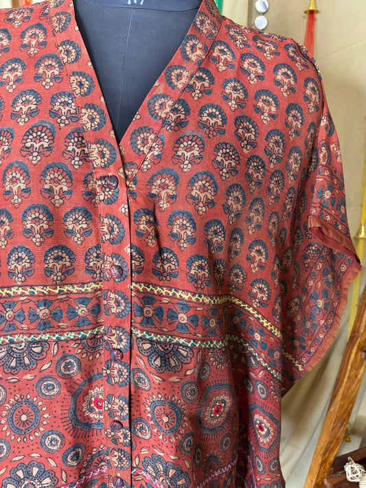 Red Ajrakh Chanderi Shirt Kaftan with Hand Embroidery