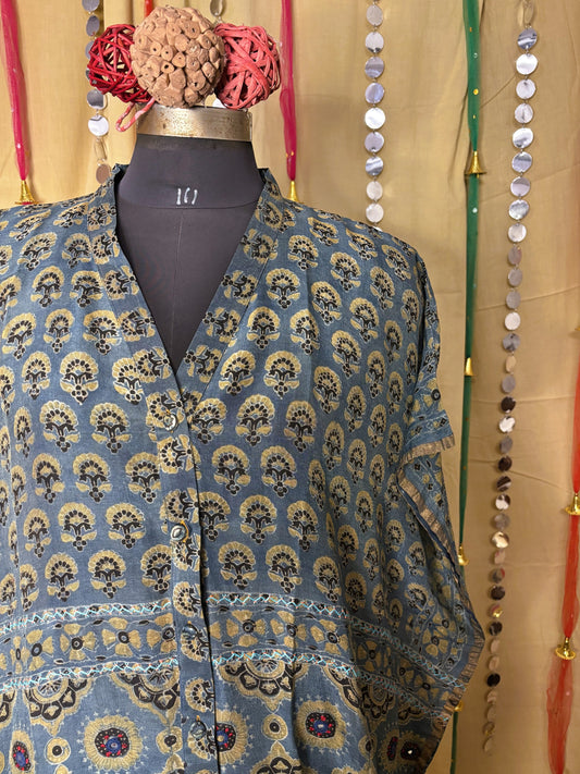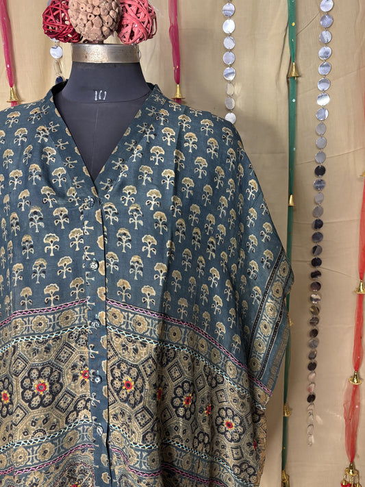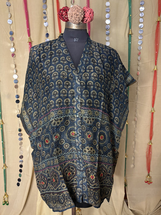 Indigo Green Ajrakh Chanderi Shirt Kaftan with Hand Embroidery