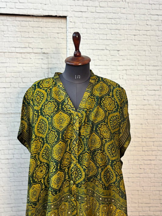 Green Ajrakh Chanderi Shirt Kaftan with Sequin Detailing