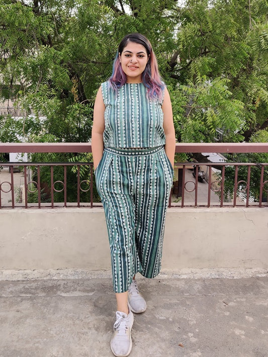 Green Blue Hand Block Printed Short Kurti Coordinated Set with Lace Detailing