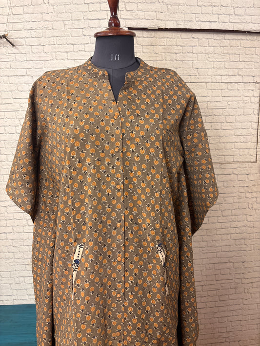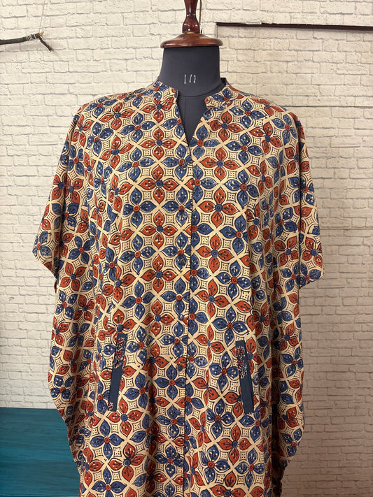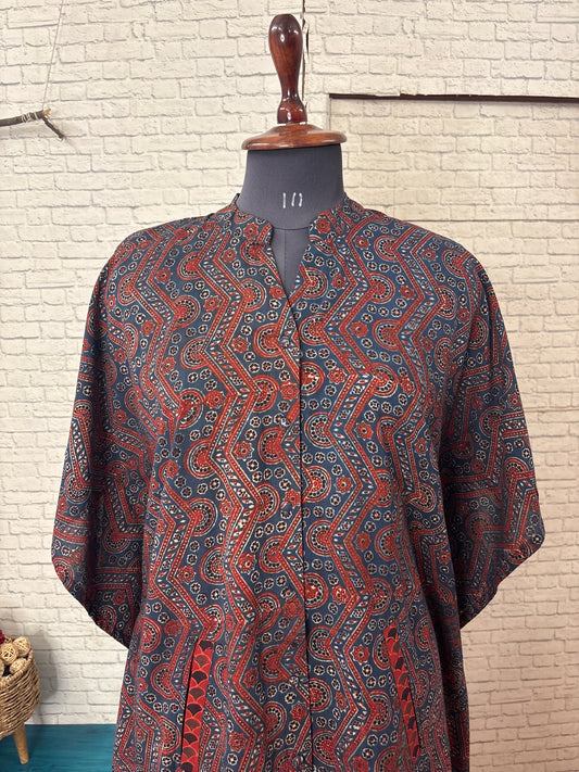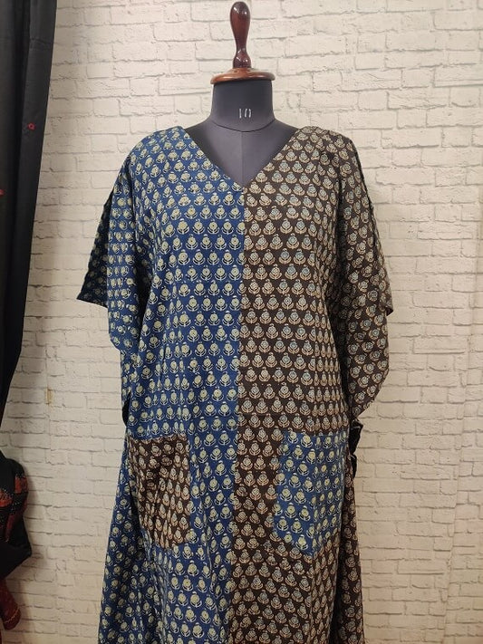 Blue Brown Ajrakh Hand Block Printed Half Half Kaftan