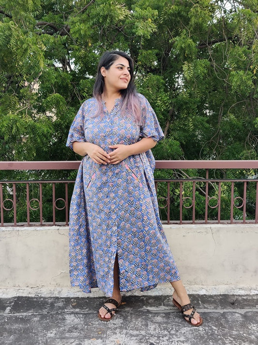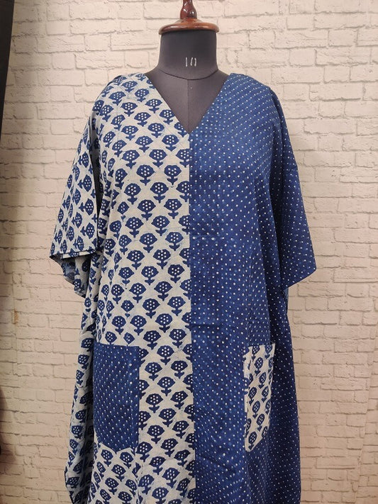 Indigo White Hand Block Printed Half Half Kaftan