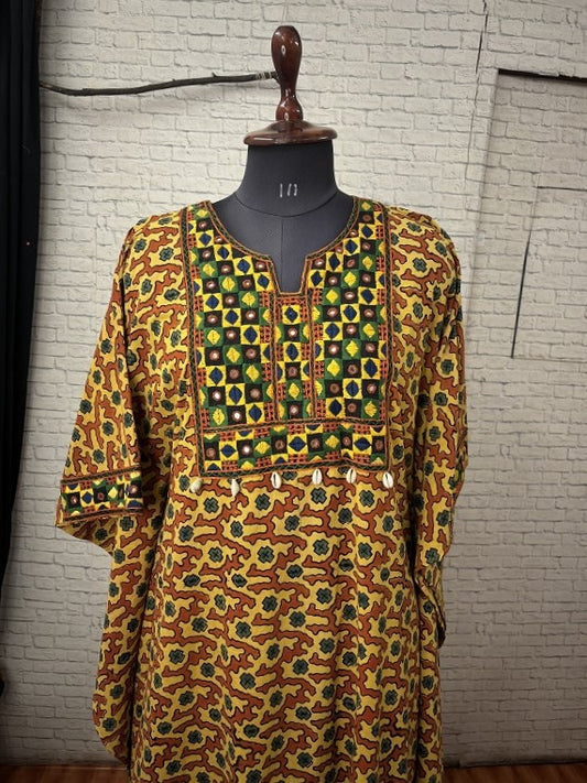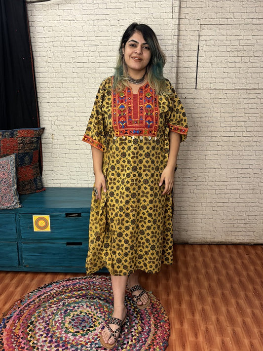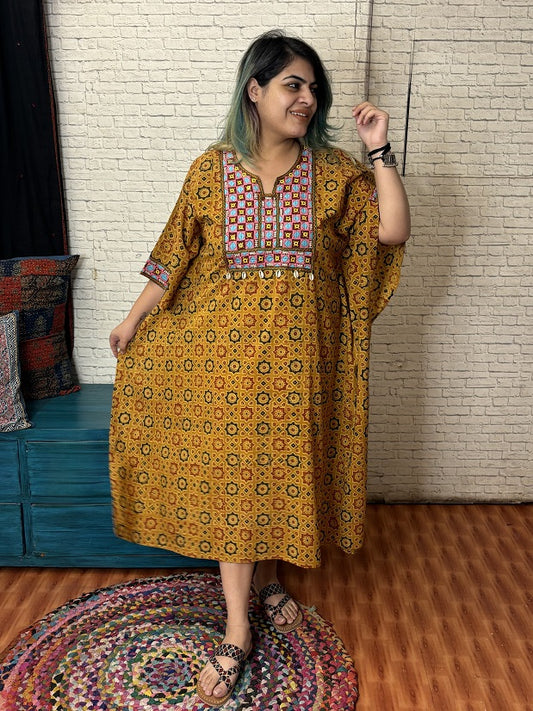 Yellow Ajrakh Hand Embroidered Patch Kaftan