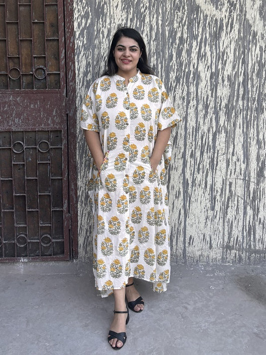 White Yellow Mughal Hand Block Printed High Low Long Shirt Kaftan
