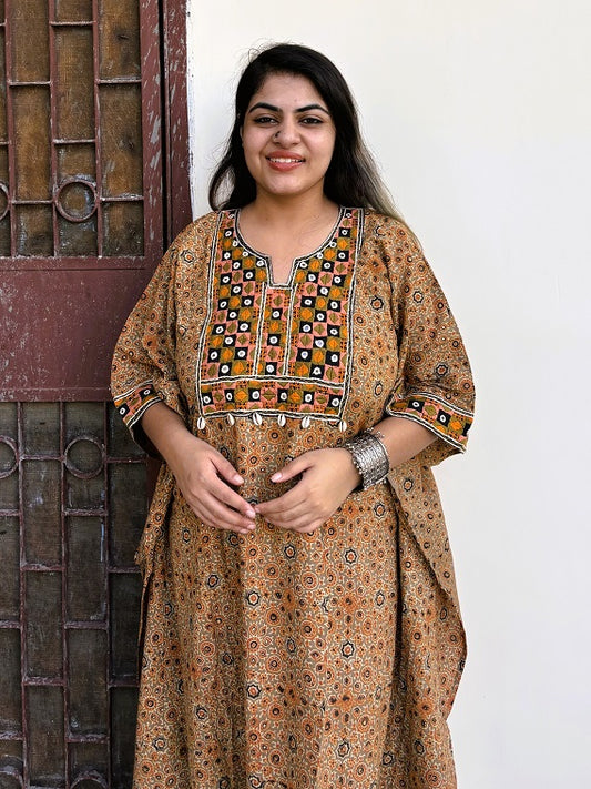 Kashish Orange Ajrakh Hand Embroidered Patch Kaftan