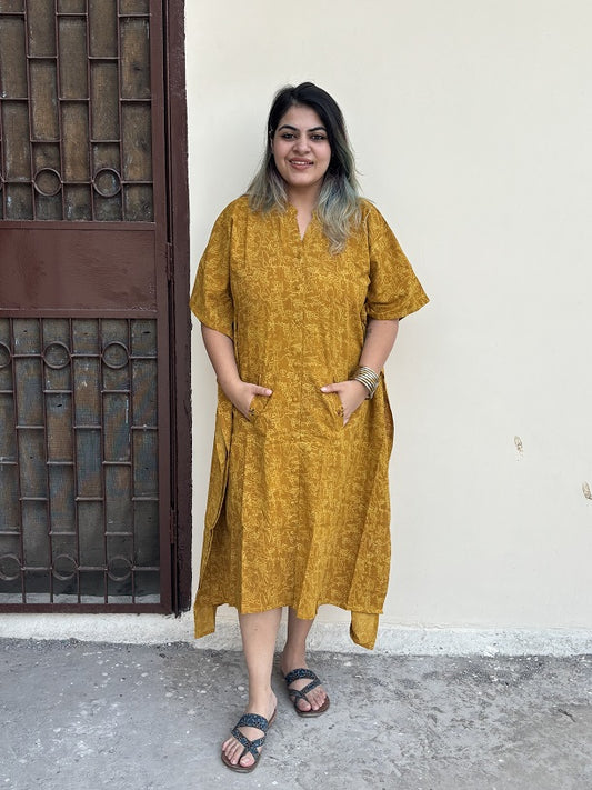 Yellow Ajrakh High Low Midi Cotton Shirt Kaftan