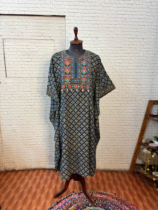 Indigo Green Ajrakh Hand Embroidered Patch Kaftan