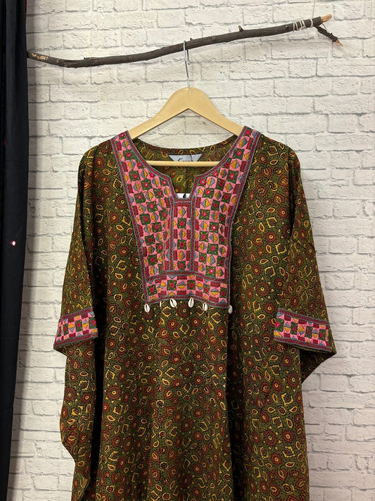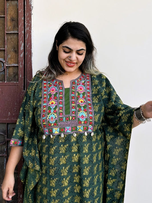 Green Ajrakh Hand Embroidered Patch Kaftan