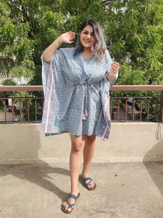 Blue Pink Hand Block Printed Knee Length Kaftan