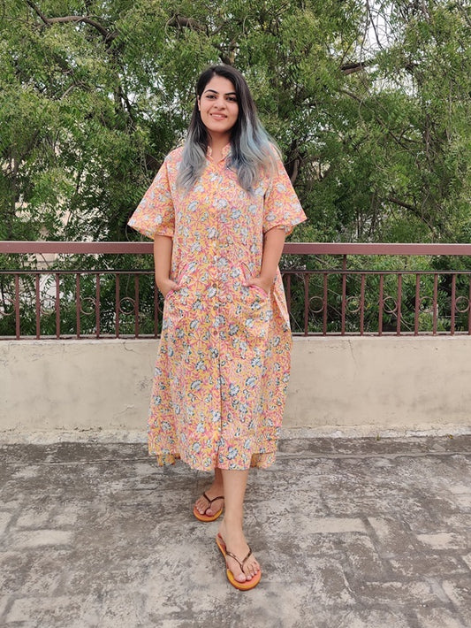 Yellow Pink Hand Block Printed High Low Long Shirt Kaftan