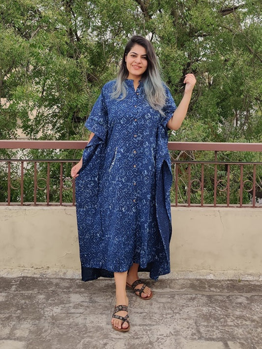 Indigo Hand Block Printed High Low Long Shirt Kaftan