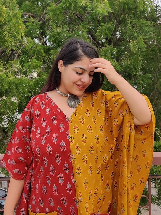 Red Yellow Ajrakh Hand Block Printed Half Half Kaftan