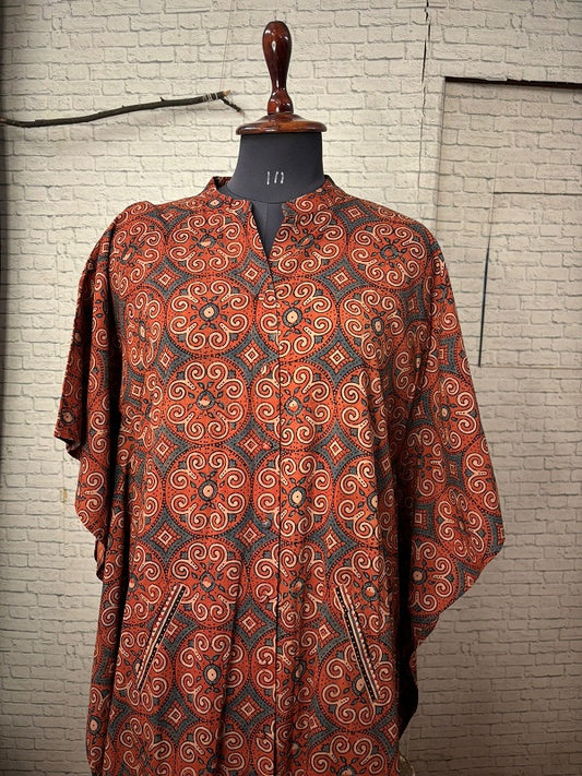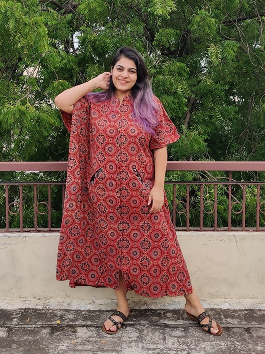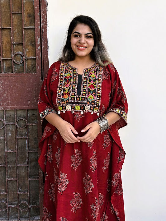 Red Ajrakh Hand Embroidered Patch Kaftan