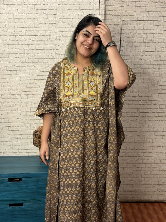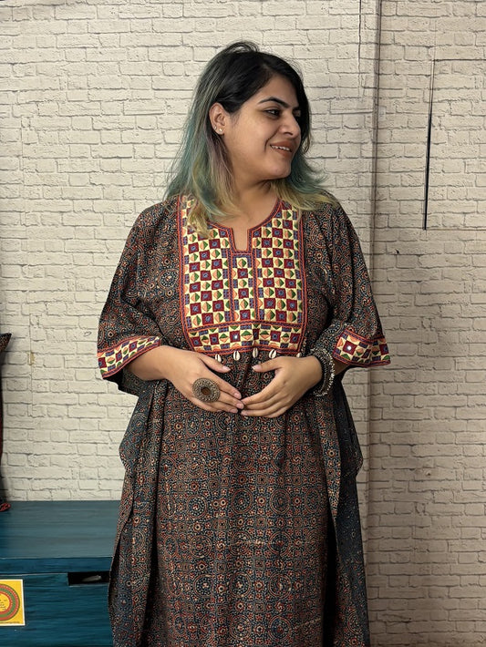 Brown Ajrakh Hand Embroidered Patch Kaftan