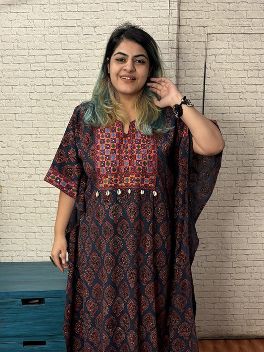 Indigo Red Ajrakh Hand Embroidered Patch Kaftan