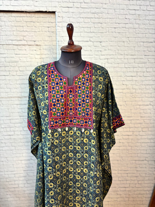 Indigo Green Ajrakh Hand Embroidered Patch Kaftan