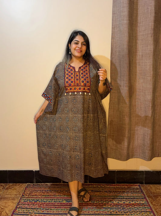 Greyish Brown Ajrakh Hand Embroidered Patch Kaftan