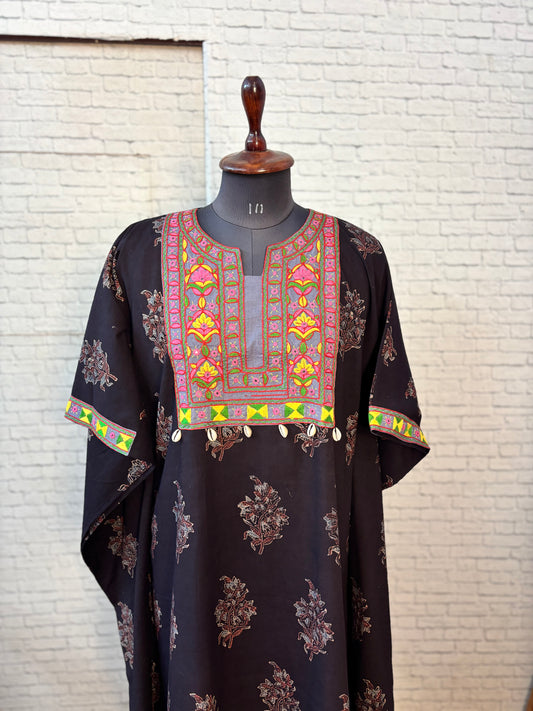Black Ajrakh Hand Embroidered Patch Kaftan