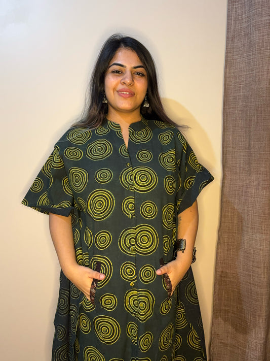 Black Olive Green Ajrakh Long Kaftan with Gather and Tassels