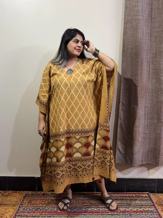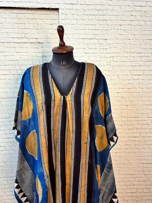 Indigo Mustard Ajrakh Long Kaftan with Gather and Tassels