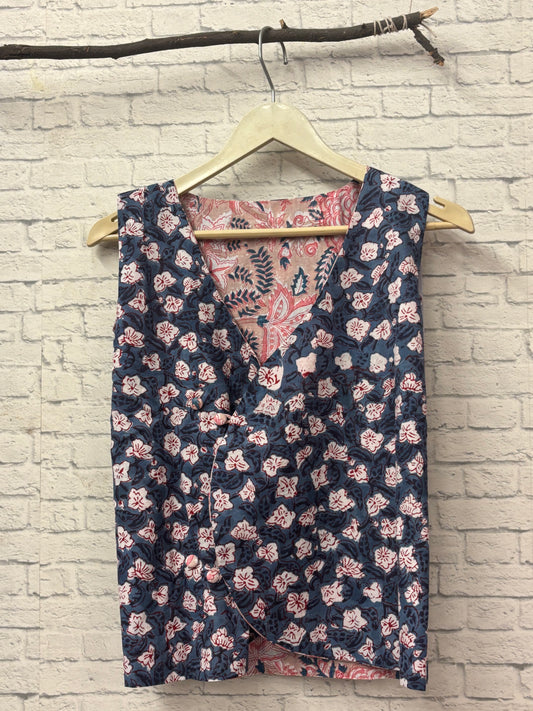Brown Blue Hand Block Printed Reversible Waistcoat