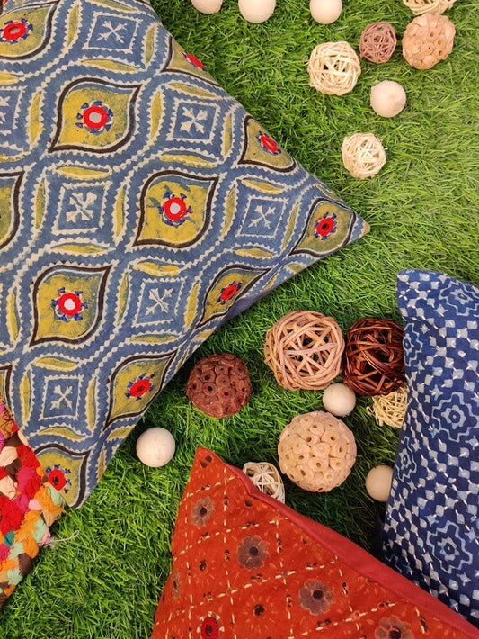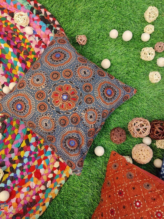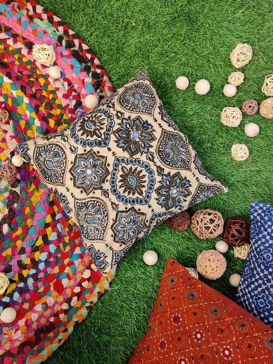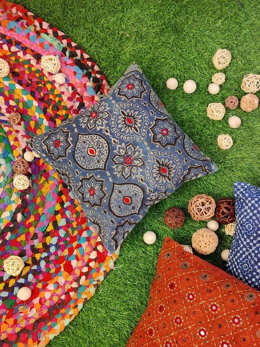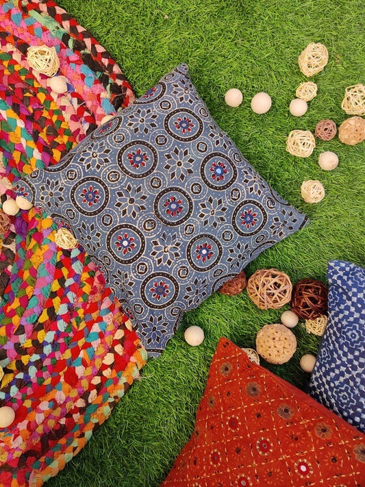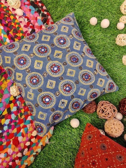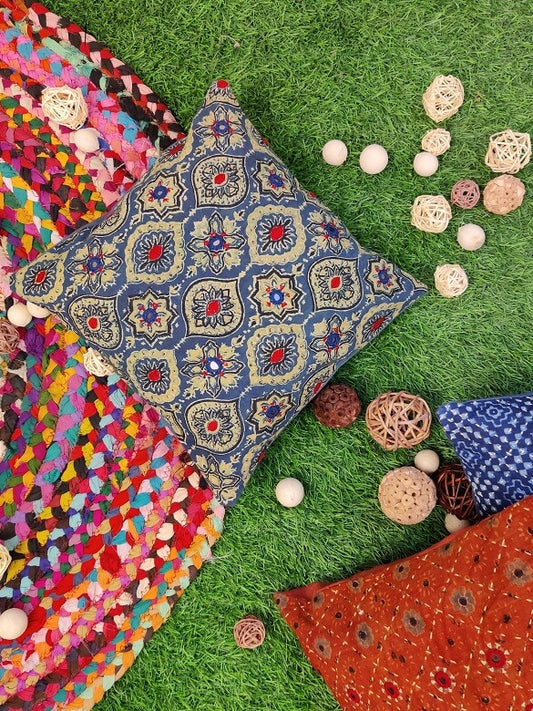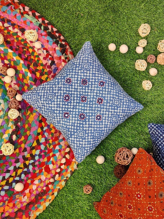 12x12 Kashish Blue Ajrakh Hand Embroidered Cushion Cover