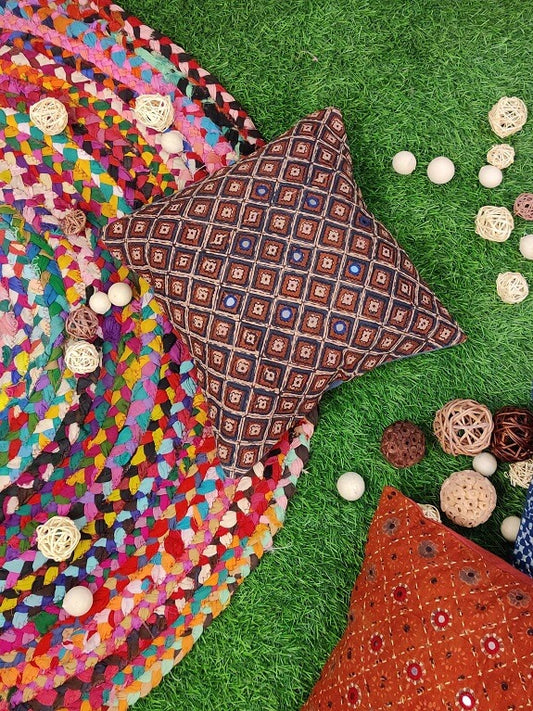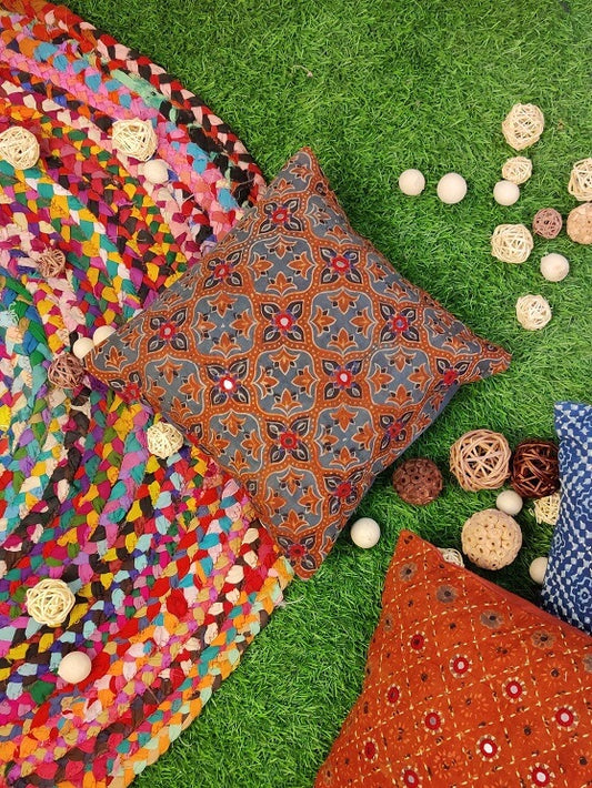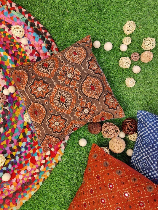 12x12 Indigo Red Ajrakh Hand Embroidered Cushion Cover