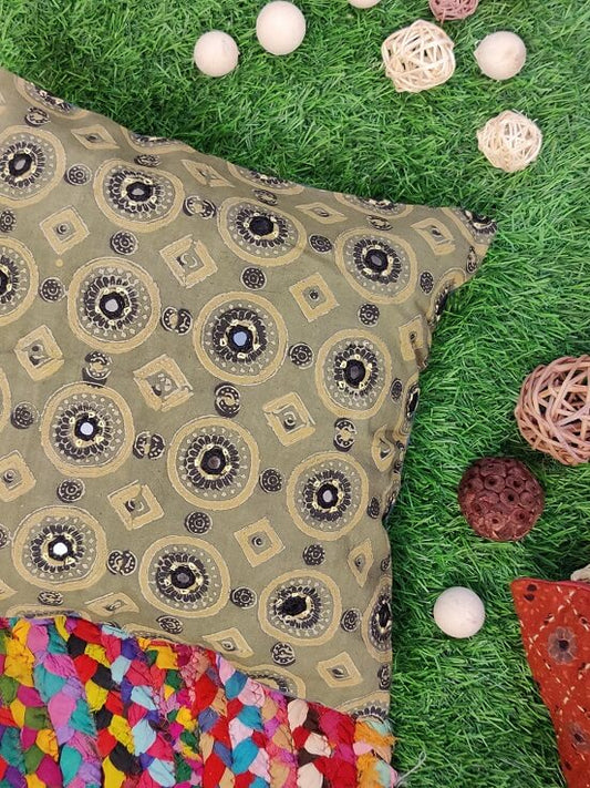 12x12 Indigo Green Ajrakh Hand Embroidered Cushion Cover