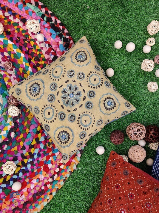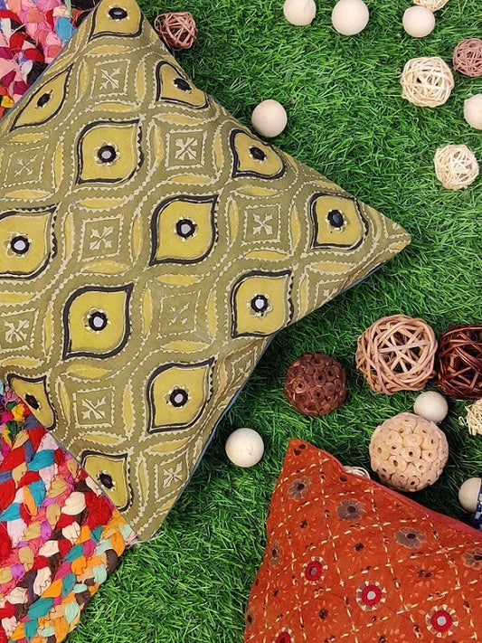 12x12 Kashish Yellow Ajrakh Hand Embroidered Cushion Cover