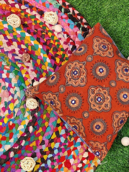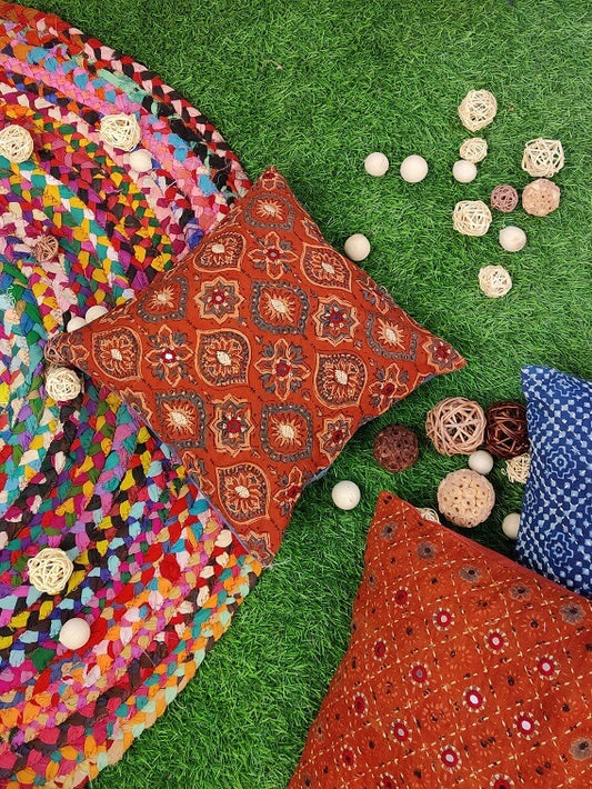 12x12 Red Ajrakh Hand Embroidered Cushion Cover