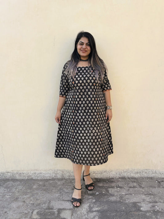 Ziya Hand Block Printed Midi Dress with Embroidered Neckline & Gota Detailing