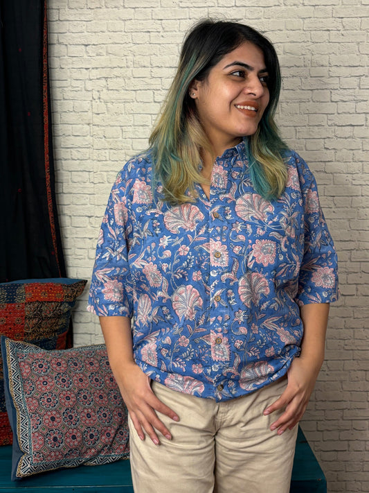 Blue Pink Floral Hand Block Printed Half Sleeves Unisex Shirt