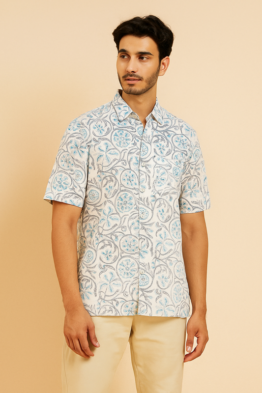 Blue Grey Floral Hand Block Printed Half Sleeves Unisex Shirt