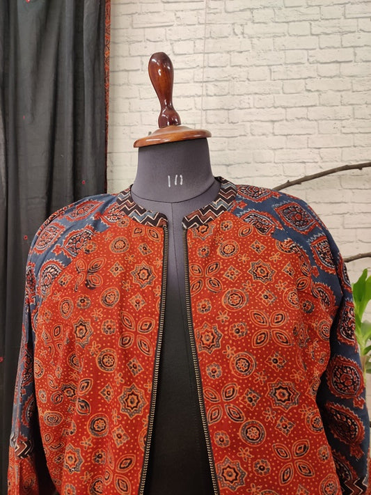 Red Indigo Ajrakh Hand Block Printed Unisex Bomber Jacket