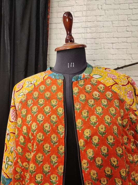 Orange Yellow Hand Block Printed Unisex Bomber Jacket