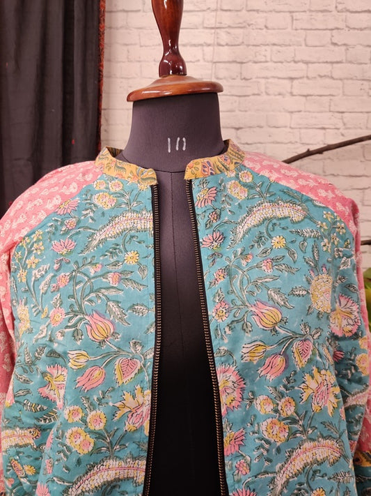 Green Pink Floral Hand Block Printed Unisex Bomber Jacket