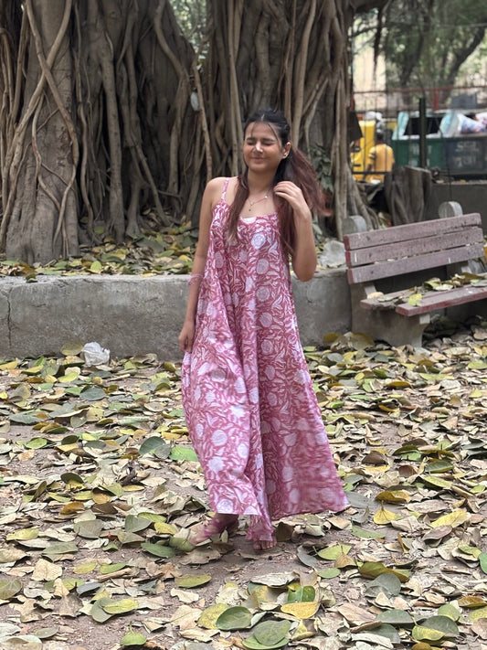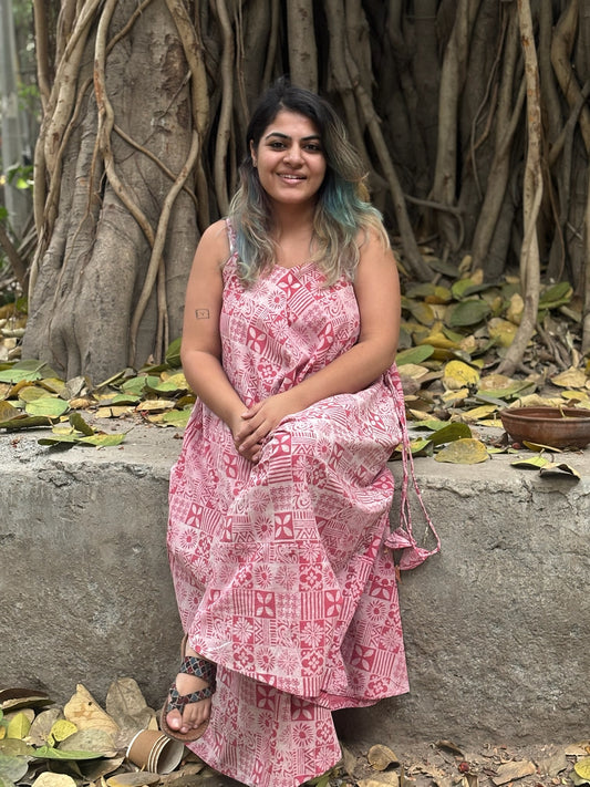 Pink Tiles Hand Block Printed Floral Flared Jumpsuit