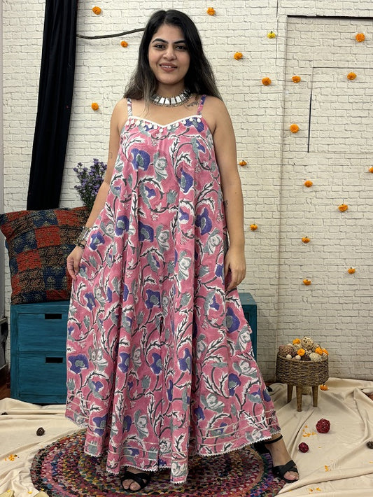 Blue Pink Hand Block Printed Floral Flared Jumpsuit