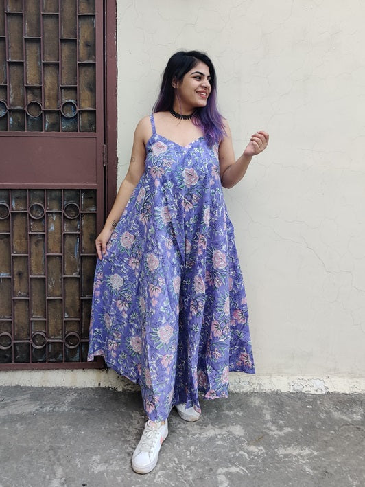 Purple Pink Hand Block Printed Floral Flared Jumpsuit