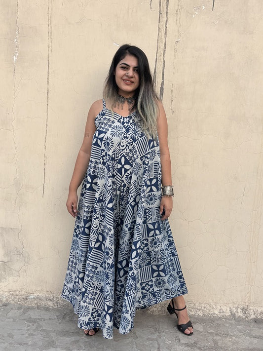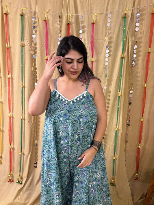 Indigo Tiles Hand Block Printed Floral Flared Jumpsuit