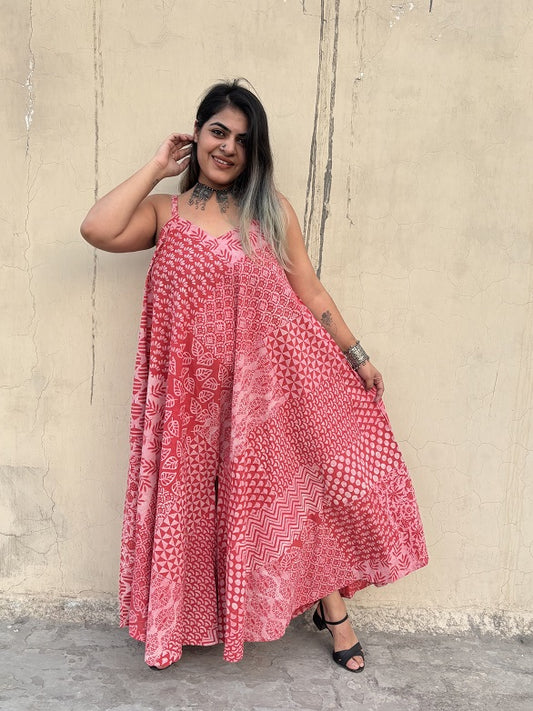 Vinaya Hand Block Printed Flared Jumpsuit with Gota Detailing