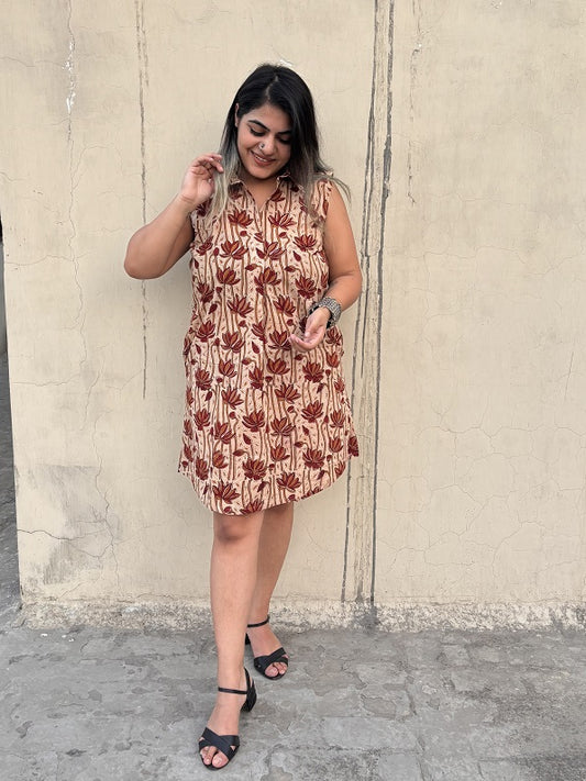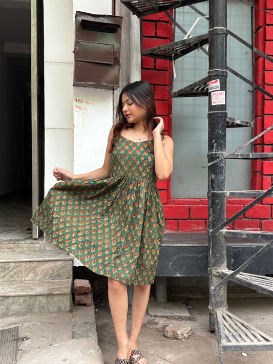 Gulabo Hand Block Printed Knee Length Dress with Shoulder Tie