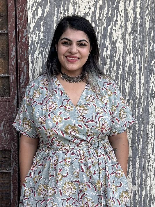 Green Red Floral Hand Block Printed Knee Length Wrap Dress
