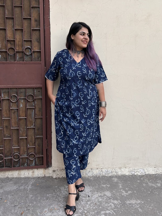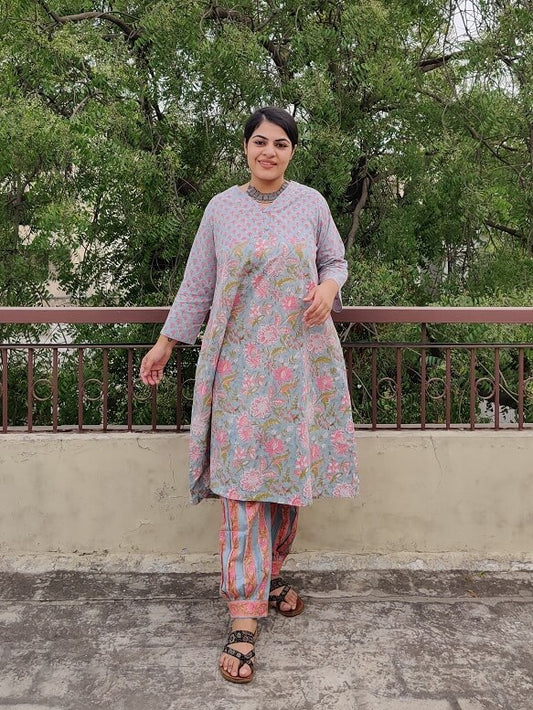 Meadowsweet Hand Block Printed Cotton Kurta Set with Afghani Pants