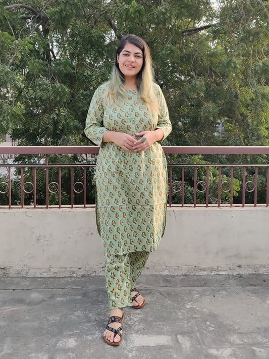 Green Yellow Floral Hand Block Printed Coordinated Kurta Set